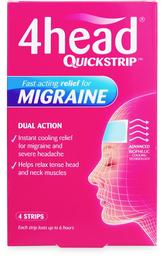 4head QuickStrip is an advanced hydro-gel strip designed to deliver instant cooling relief from migraine and severe headache pain. The cooling sensation helps relax tense muscles in the head and neck, providing calming relief that lasts up to six hours. It can be used with or without oral medication and does not require refrigeration. The strips leave no visible residue and are suitable for all skin types, including during pregnancy and breastfeeding. Recommended for individuals aged 12 years and above, including children over 12. The strips can be applied to the forehead, back of the neck, or temples and are single-use only.