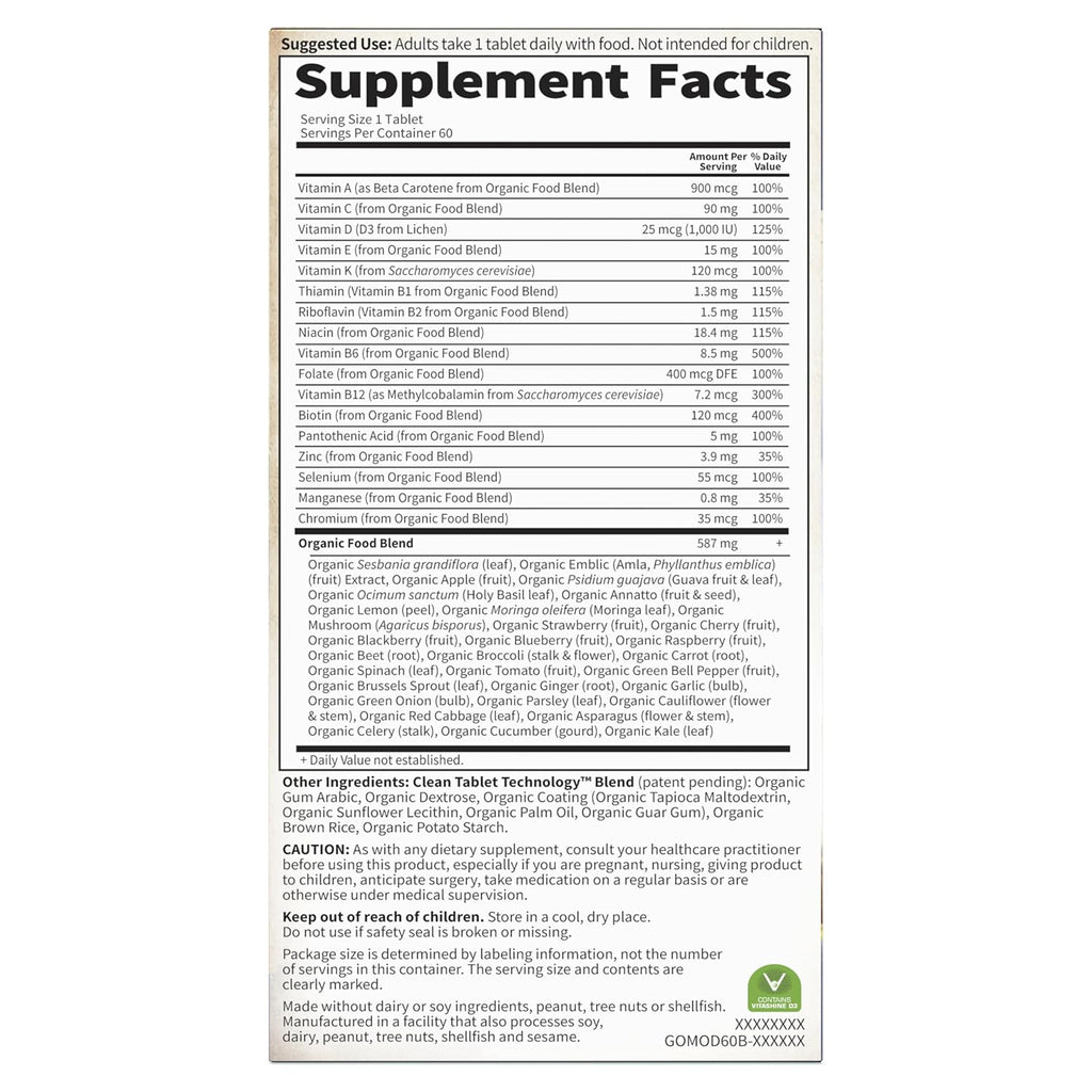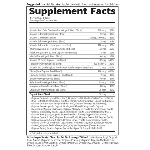 This organic whole food multivitamin for men delivers essential vitamins and minerals sourced from over 30 organically farmed fruits, vegetables, and herbs. Designed to support sustained energy, healthy metabolism, and heart health, it features vitamin D3 from lichen and selenium for prostate health. The formula provides 15 key vitamins and minerals, all at or above 100% Daily Value, including vegan vitamin B12 for natural energy without synthetic additives. Certified organic, non-GMO, gluten-free, and vegan, this multivitamin is made using water extraction to preserve nutrient bioavailability. The product is free from artificial colours, preservatives, dairy, soy, peanuts, tree nuts, and shellfish. Its patented Clean Tablet Technology ensures superior quality and ease of digestion. Recommended for daily use, one tablet supports overall men's health and well-being with a gentle, natural formula.