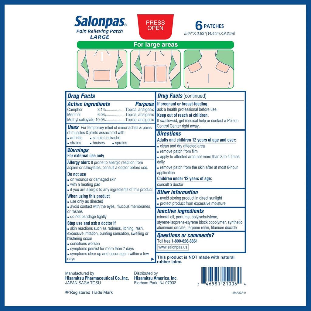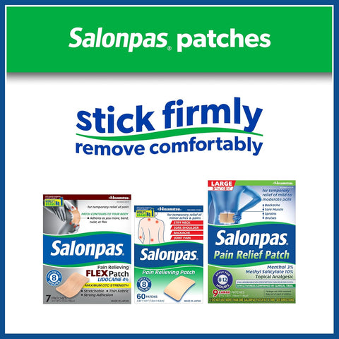 Salonpas Large Pain Relieving Patch offers targeted, effective relief for muscle and joint pain in large areas such as back, neck, shoulder, and knees. The patch features a blend of three analgesics: camphor, menthol, and methyl salicylate, which penetrate deeply to soothe discomfort. Designed with flexible fabric and rounded corners, the patch conforms to body movements and stays securely in place. It provides mess-free, topical pain relief that lasts up to 8 hours, alleviating muscle soreness, sprains, and joint aches. Easy to apply and remove, the patch is suitable for temporary relief of aches without the need for oral medication. Recommended for adults and children over 12 years, it is a convenient solution for managing arthritis, backache, and other musculoskeletal pains. The product is externally applied, safe under recommended usage, and comes in a pack of six large patches for versatile use. Salonpas ensures quality and customer satisfaction with its proven pain relief formula.