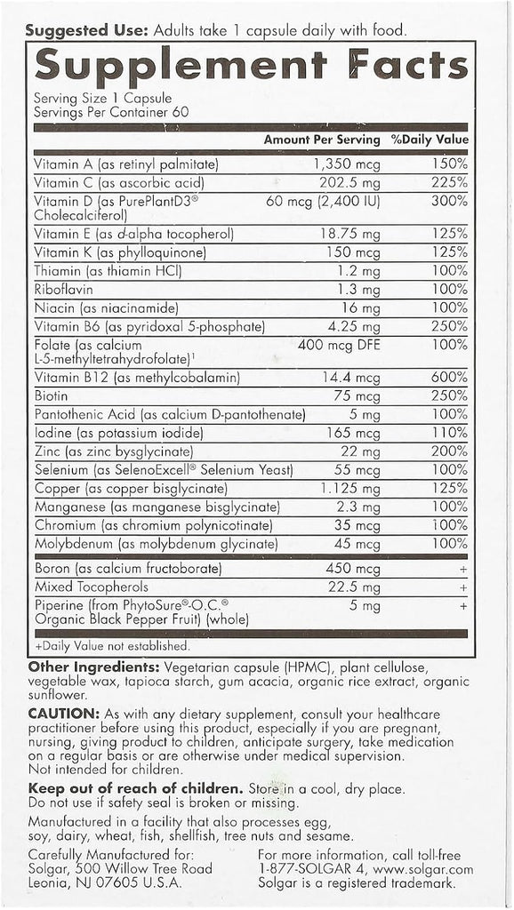 Solgar One Daily Men's Multi 50+ is meticulously formulated to address the nutritional needs of men aged 50 and above. This advanced multivitamin delivers 20 essential vitamins and minerals in highly absorbable forms, all contained within a delayed-release vegan capsule. The formula supports heart health with L-5-MTHF folate and Vitamin E, boosts energy and manages stress through B-vitamins including methylcobalamin (B12), and promotes muscle and bone strength with plant-based Vitamin D3 and retinyl palmitate (Vitamin A). Furthermore, it enhances prostate health by providing optimal amounts of Selenium and twice the daily value of Zinc as zinc bisglycinate. Free from gluten, dairy, soy, and artificial additives, this supplement embodies Solgar's commitment to quality and purity for whole body wellness. One capsule daily delivers comprehensive support for vitality, longevity, and well-being in men over 50.