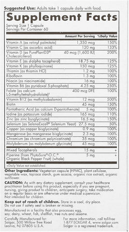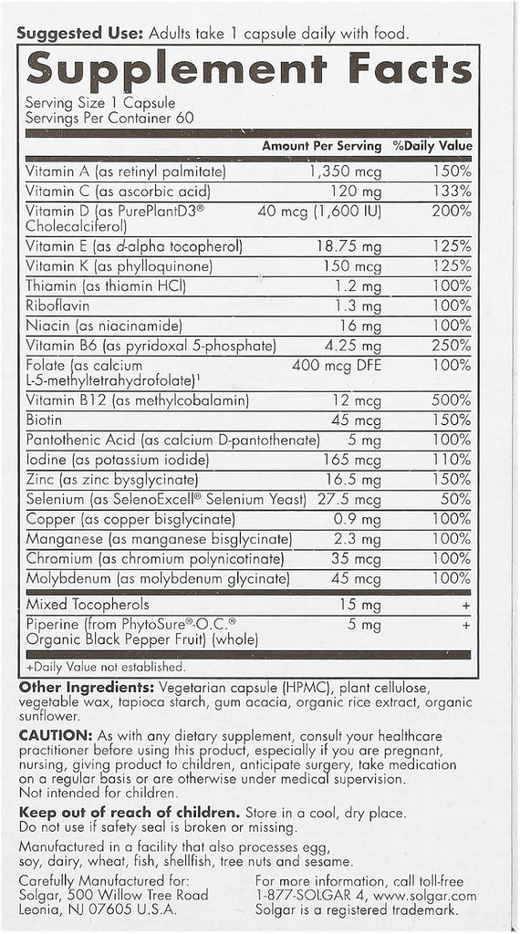 Solgar One Daily Men's Multivitamin offers comprehensive nutritional support tailored to men's health needs. This formula delivers 19 essential vitamins and minerals in a highly absorbable, delayed-release vegan capsule. Key nutrients include Zinc bisglycinate and Vitamin C for immune defense, B-vitamins for energy metabolism and stress modulation, plant-based Vitamin D3 and Vitamin A for muscle and bone integrity, and L-5-MTHF alongside Vitamin E for cardiovascular health. Designed using the latest dietary recommendations, these capsules support overall vitality with one convenient daily dose. The product is gluten-free, dairy-free, soy-free, kosher, and non-GMO certified. Manufactured by Solgar, a brand committed to quality and purity for over 75 years, this multivitamin simplifies supplementation while advancing whole body wellness.