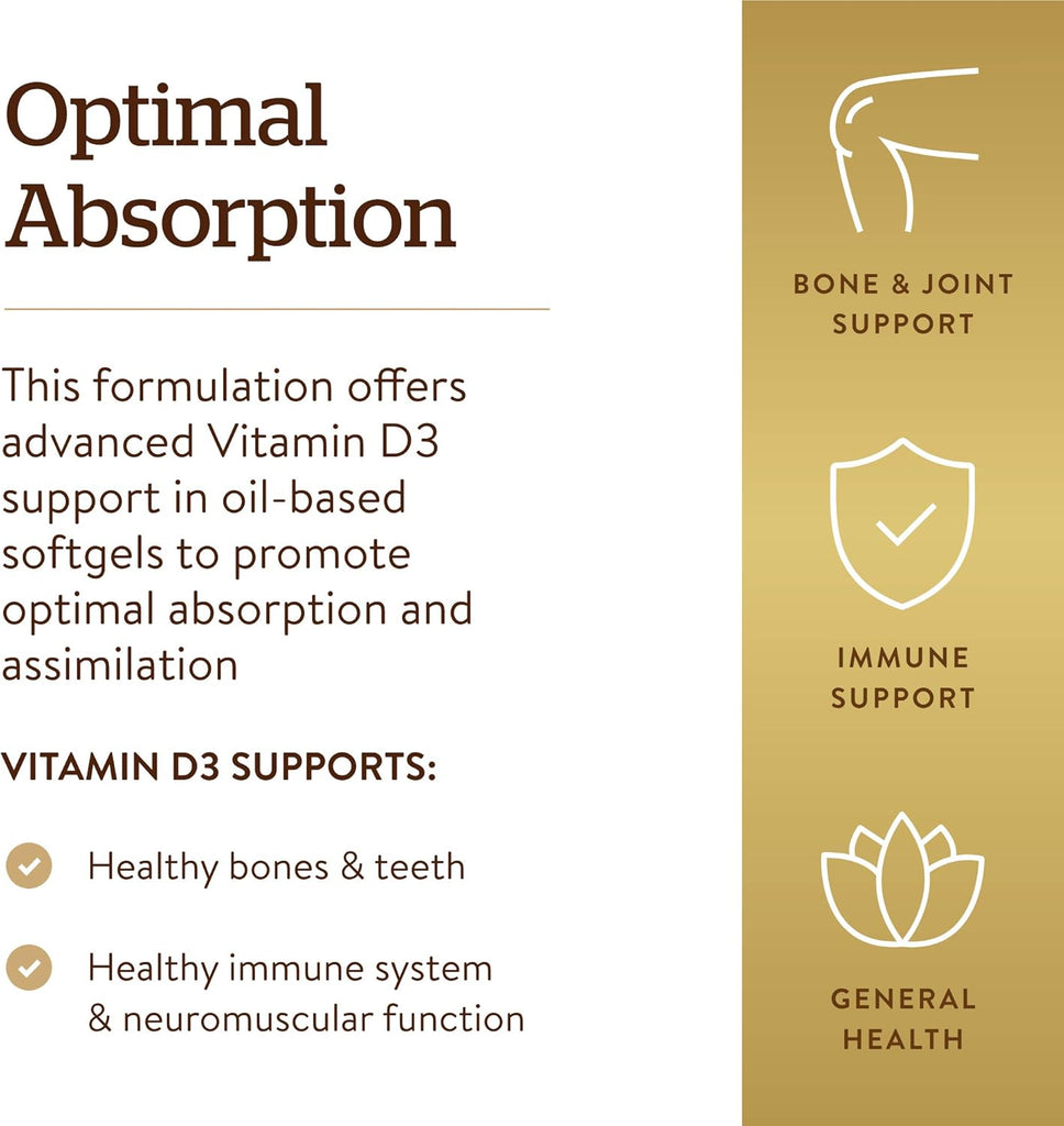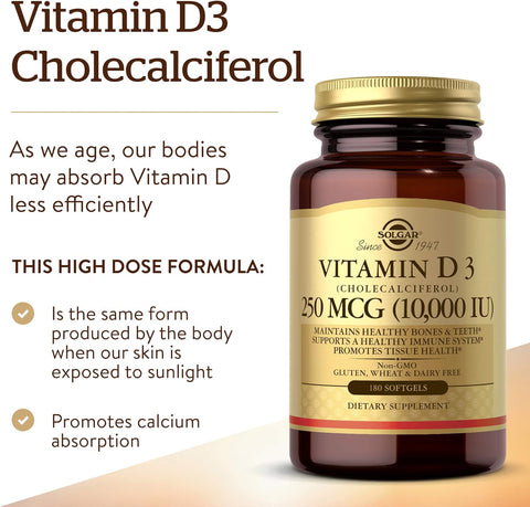 Solgar Vitamin D3 Softgels provide a potent 250 mcg (10,000 IU) dosage per softgel, vital for promoting calcium absorption necessary for maintaining healthy bones and teeth. This advanced formulation uses cholecalciferol, the natural form of Vitamin D produced by the body through sunlight exposure, ensuring optimal absorption and assimilation. The softgels support immune system health and neuromuscular function, addressing reduced Vitamin D absorption in aging adults. Each softgel is formulated without common allergens, being non-GMO, gluten-free, dairy-free, soy-free, and free from artificial preservatives, colors, and sweeteners. Made with high-quality raw materials, these oil-based softgels enhance bioavailability while ensuring product purity and efficacy. With over 70 years of commitment to quality, Solgar offers this supplement to support overall wellness and a healthy immune response effectively. The product is designed for daily use, ideally taken with meals for maximum benefit. Packaged in a convenient bottle containing 180 softgels, it provides a long-lasting supply for continuous Vitamin D support. The softgels' small, easy-to-swallow size and unflavored formulation enhance user compliance and comfort. This supplement complies with stringent quality standards, reflecting Solgar's dedication to producing superior health products for sustained wellbeing.