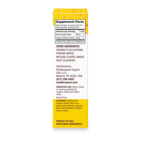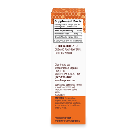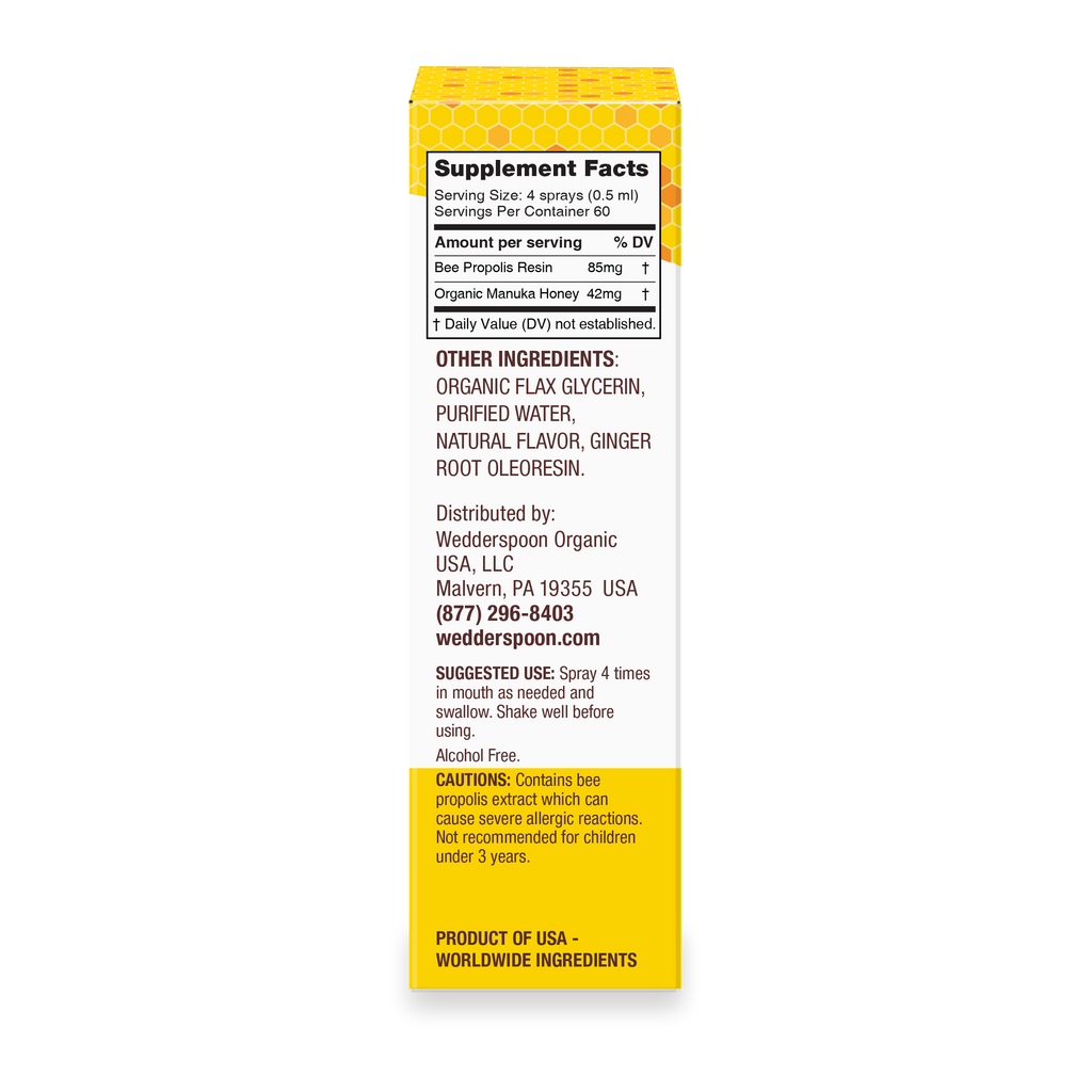 | Ingredients | Bee Propolis, New Zealand MGO 400+ Manuka Honey, Organic Flaxseed Glycerin, Natural Spices and Herbs |